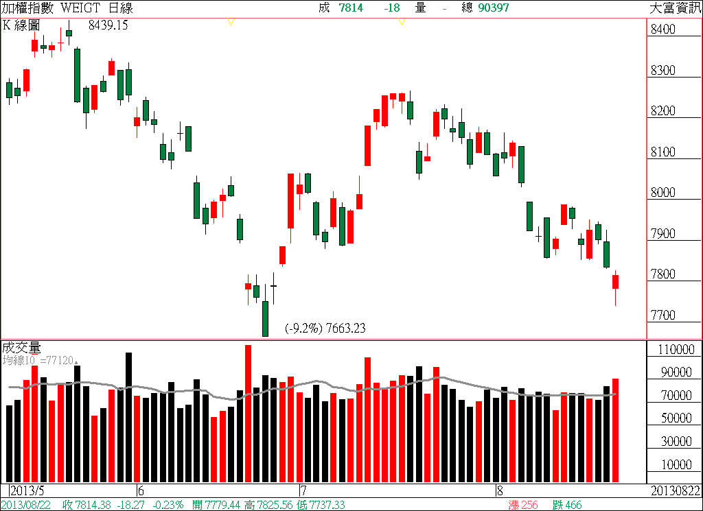 因此,除非接下來市場多方能夠將台股指數成功繼續守穩在年線之上,不致在未來短線的五~八個交易日內,再度見到跌落至年線之下,否則,對市場多方而言,連「7663點」前波反彈漲勢發動低檔,能否成功發揮強勁的撐盤、護持台股力道,都還得要打上一個大大的問號!終場收盤時,加權指數以7814.38點作收,下跌18.27點,跌幅0.23%,市場成交總金額903.97億元。