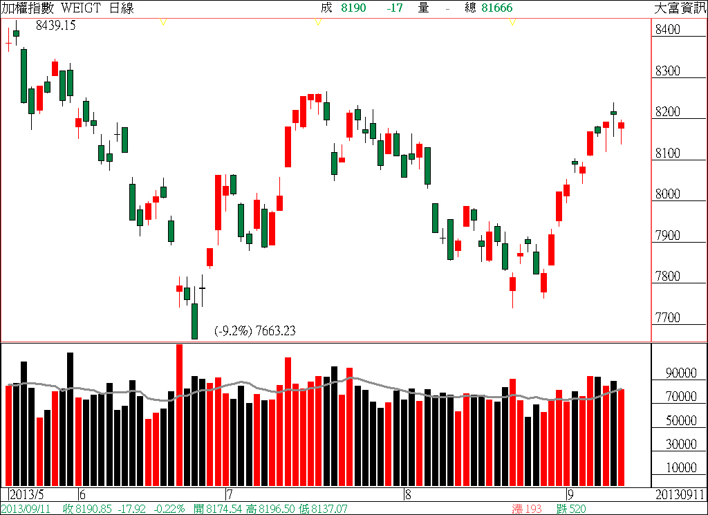 因此,好不容易最近幾天台股因為「王馬政爭」政治面干擾因素,使指數得以小幅修正回檔、測試下檔支撐,使得盤面個股股價也跟著拉回整理,形同為目前手中仍為空手、正急著尋找標的個股的投資朋友,帶來難得的布局機會。終場收盤時,加權指數以8208.99點作收,上漲0.22點,漲幅0.01%,市場成交總金額893.29億元。