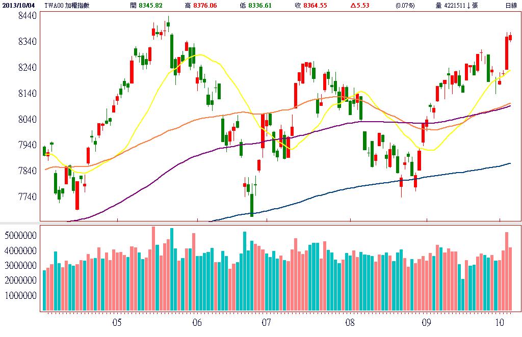昨日成交量能擴大至1143億元,依目前的資金移往「非電」產業走勢發展,水泥、紡織、汽車、生技及金融證券等類股,近期表現皆十分強勁。包括台泥(1101)受惠QQ4水泥價格漲價及基礎建設趕工潮,大成(1210)切入種豬事業,未來將結合原有雞品事業,上海自由貿易區對台灣金融及證券產業,也有非常極正面看法。台北股市集中市場加權股價指數今天開盤指數8345點,最高8376點,最低8336點,終場收8364點,成交量915.54億元。