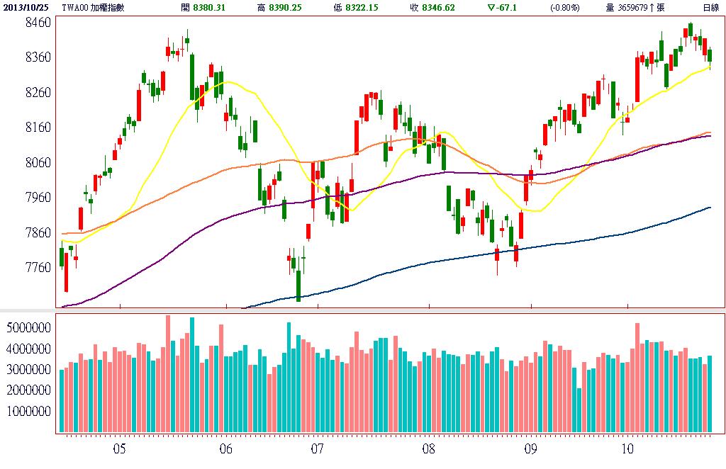 受亞股早盤走弱影響,台股今日開盤直接就以下跌開出,加上電子、金融雙主力紛紛開始走弱,明顯衝擊市場信心,造成盤中跌幅一路擴大,不僅最大跌幅逼近百點,更一度跌破月線支撐,所幸收盤又重新站回。終場加權指數以8346.62點作收,下跌67.10點,跌幅0.80%,市場成交總金額799.09億元。