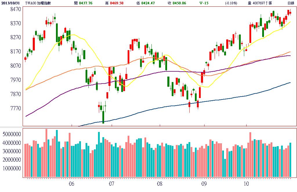 即便美國QE如期按兵不動,但因美國經濟展望較預期樂觀,且聯準會語氣也不像先前那麼鴿派,市場解讀退場時間恐將提前,衝擊昨日美股均呈現開高走低的跌勢,加上國內主計處又下修第三季經濟成長率至1.58%,拖累台股今日開盤後就一路在盤下震盪,唯盤中在受惠4G結標的網通族群上演慶祝行情帶動下,指數一度觸及8469點的新高價位,可惜尾盤追價買盤力道不足,以下跌作收。終場加權指數以8450.06點作收,下跌15.00點,跌幅0.18%,市場成交總金額843.31億元。