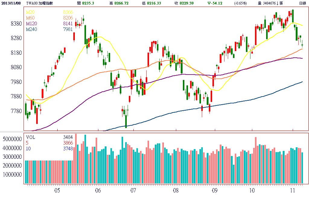 昨日美股大幅重挫,加上MSCI雙雙調降台股在新興市場指數及新興亞洲指數比重的衝擊,今日台股直接跳空開低,盤中跌幅曾一度控制住,但因指數遲遲無法向上彈升,且在盤面已無主流類股帶動、外資籌碼也翻空影響下,引發不耐久盤的恐慌性賣壓再度出籠,造成指數再度下殺逼近季線位置。終場加權指數以8229.59點作收,下跌54.12點,跌幅0.65%,市場成交總金額734.52億元。