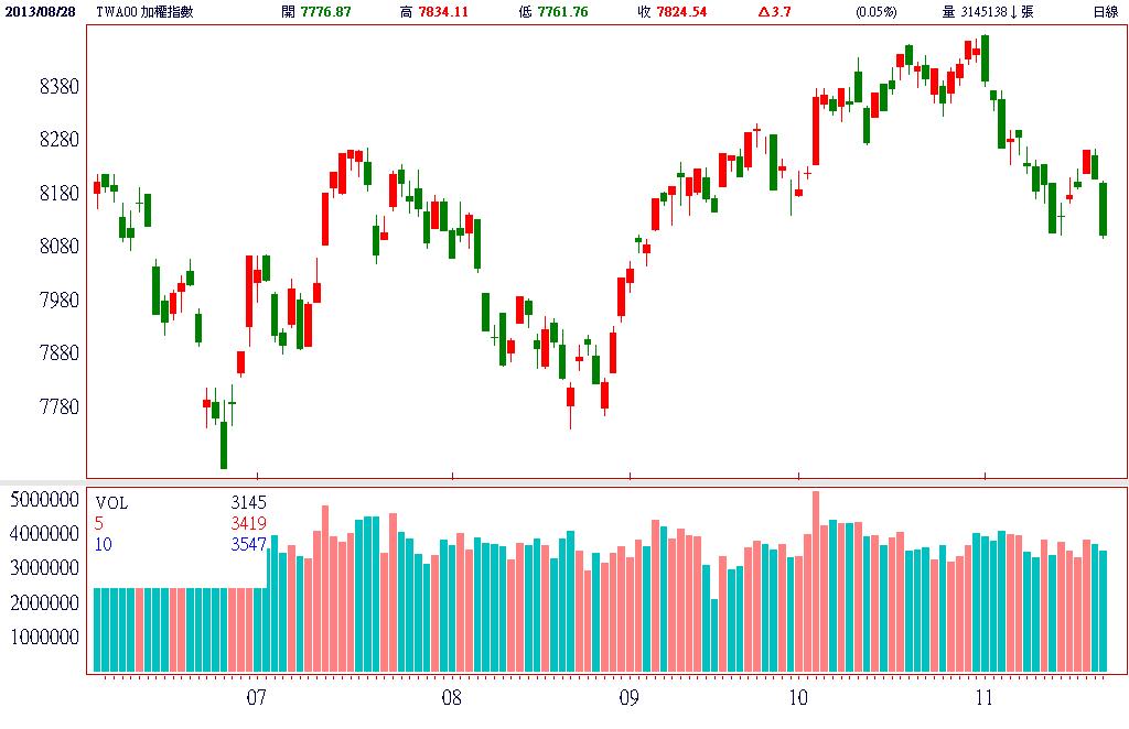 受歐美股市持續拉回、韓股無法續彈、QE傳出將退場及外資空單仍近萬口等利多影響,今日台股開盤直接跳空開低,加上台灣50及中型100等權值股出現全面性的走弱,衝擊指數一路走低,不僅大跌逾百點,更跌破前低的8200點。終場加權指數以8099.45點作收,下跌105.01點,跌幅-1.28%,市場成交總金額為744.51億元。
