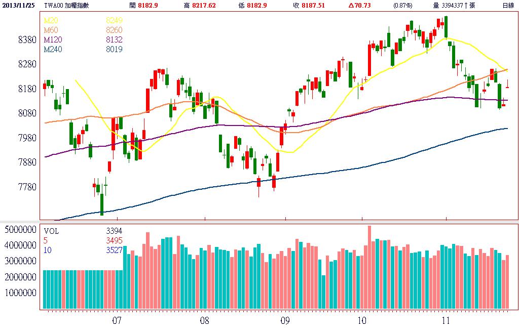 美股多頭氣勢如紅,道瓊再創新高,激勵今日亞股紛紛同步開高,加上台股則是又有官股行庫「公公併」的利多題材加持,早盤指數一路衝高大漲百點。可惜目前市場多頭信心仍不足,以致盤中追價買盤意願不高,量能也未能跟著放大,台股自然無力再向上挑戰月線。終場加權指數以8187.51點作收,上漲70.73點,漲幅0.87%,市場成交總金額為661.92億元。