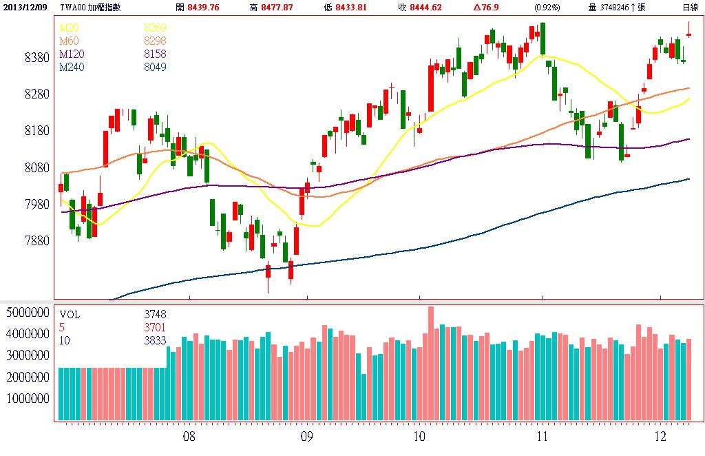 在上週五美股上漲及四大證券單位攜手舉辦「股票配個股期」聯合記者會利多激勵下,今日台股早盤開高走高,盤中一度大漲逾百點,衝上8477點再創波段新高,並扭轉技術指標走空的態勢。可惜午盤過後,中小型股的調節賣壓陸續出籠,連帶影響盤面多頭信心,漲幅也跟著開始收斂,連兩天日K線留下上引線。終場加權指數以8444.62點作收,上漲76.90點,漲幅0.92%,市場成交總金額為829.41億元。
