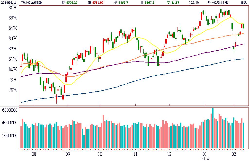 受八大行庫由買轉賣及MSCI雙雙調降新興市場及新興亞洲市場指數的利空影響,今日台股無法繼續挑戰月線,並出現向下壓回的走勢。不過,因近期外資操作開始翻多,加上目前大盤日KD剛從低檔交叉向上,形成下檔的支撐力量。預期接下來台股應會呈現月線及季線間的高檔震盪格局。終場加權指數以8467.70點作收,下跌43.17點,跌幅0.51%,市場成交總金額為756.69億元。