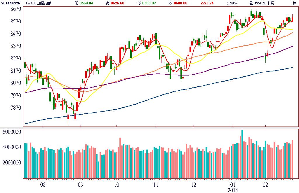 今日台股在外資買盤持續力挺下,無畏歐美股市拉回的負面影響,逆勢向上衝高,其中大立光(3008)、鴻海(2317)、宏達電(2498)、廣達(2382)等電子權值股,受惠財報優於預期及電子展利多,成為推升指數的重要功臣,尤其大立光及漢微科(3658)兩千金雙雙大漲,更是為多頭部隊增添不少信心。終場加權指數以8600.86點作收,上漲25.24點,漲幅0.29%,市場成交總金額為1043.54億元。
