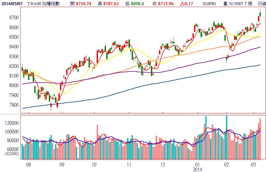 隨著加權指數正式突破上檔反壓改寫波段新高,讓市場投資氣氛更為樂觀,成交量能也跟著同步放大,但也因此讓本波已大賺一筆的內資有逢高獲利了結的可趁之機,正是今日櫃買指數豬羊變色,暴量大跌1.6%的主因,連帶拖累加權指數開高走低,留下一根大量黑K。終場加權指數以8713.96點作收,上漲0.17點,漲幅0.00%,市場成交總金額為1302.14億元。