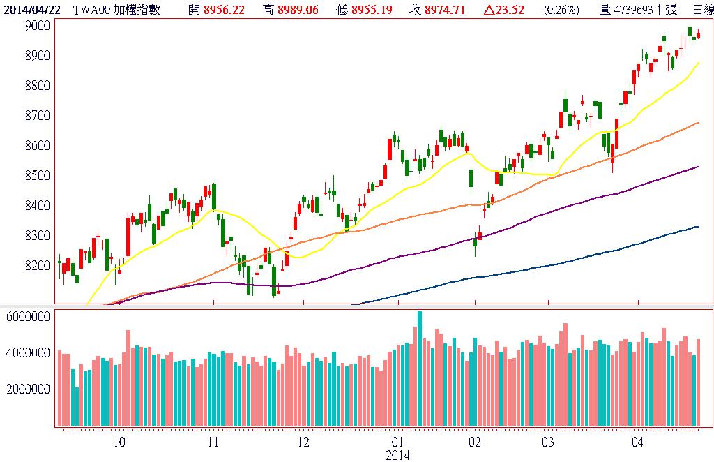受惠國內3月份外銷訂單金額年增率達5.9%,優於市場預期,加上外銷訂單年增率與加權指數的相關係數又高達0.66,將成為吸引海外資金持續流入台股的有利條件。另因今日成交量能開始回溫,股王大立光(3008)更在法說行情提早起跑下,股價衝上漲停再創掛牌新高,大幅提高買盤的追價意願,讓台股的交投氣氛轉熱。終場加權指數以8974.71點作收,上漲23.52點,漲幅0.26%,市場成交總金額為872.93億元。