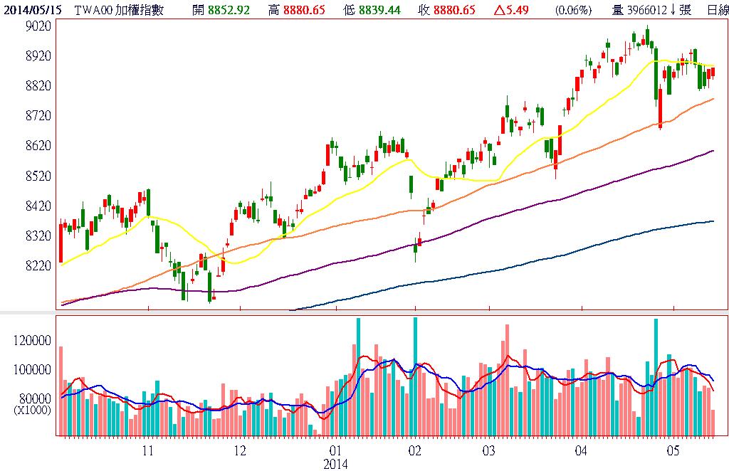 在市場氣氛轉趨保守的影響下,即便昨日外資現貨大買及期貨多單留倉重回兩萬口之上的籌碼利多,也無法延續台股的多頭攻勢,造成一早指數就直接跳空開低,所幸生技股、MSCI新增成分股接連攻擊表態,才讓跌幅開始收斂,終場以小紅作收。但觀察成交量卻是大幅萎縮,顯示指數來到月線天花板位置,投資人態度就轉為退場觀望,增添向上突破反壓的難度,也不利現階段的個股操作。終場加權指數以8880.65點作收,上漲5.49點,漲幅0.06%,市場成交總金額為717.35億元。