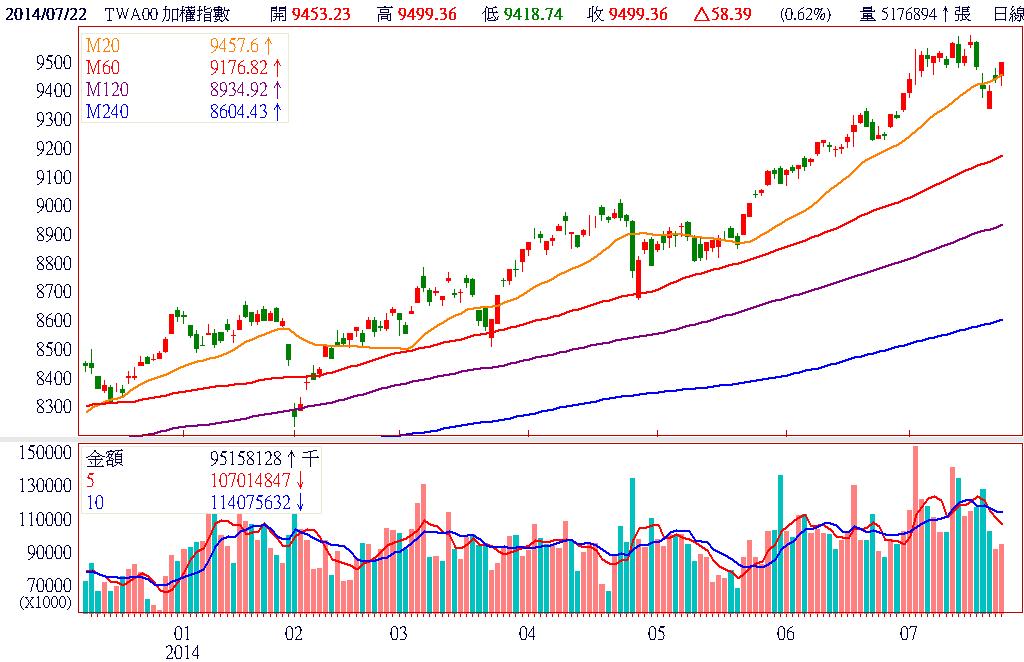 由於今日加權指數及櫃買指數已分別站上月線及季線,加上三大法人同步買超現貨,外資期貨多單留倉又增加到5千口之上,不僅會誘使先前仍在觀望的買盤進場,更將有助台股開始止穩,個股也能好好反應各自的利多題材。終場加權指數以9499.36點作收,上漲58.39點,漲幅0.62%,市場成交總金額為950.24億元。