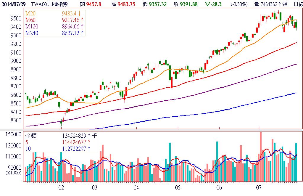 受到美國費半指數領先跌破季線影響,形成國內半導體類股的修正壓力,今日又以前波熱炒的物聯網、穿戴式裝置概念股災情最為慘重,拖累加權指數由紅翻黑,出現帶量下殺的黑K。櫃買指數則因正式跌破半年線,且離年線還有很大的空間,在市場擔心繼續回檔下,內資主力的停損賣壓紛紛出籠,小型股的跌停家數也跟著瞬間爆增。終場加權指數以9391.88點作收,下跌28.30點,跌幅0.30%,市場成交總金額為1322.30億元。