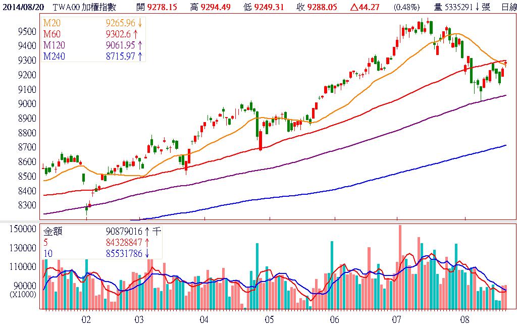 受到台指期貨結算影響,買盤縮手觀望,造成昨日強勢的蘋概股、PC股無法續強,轉由金融股來進行撐盤動作,加權指數最終仍以上漲作收,並改寫本波反彈來的最高收盤點位。三大法人進出,除了自營商賣超外,投信、外資持續站在買方,外資期貨留倉空單也在結算後續減到235口,態度明顯轉向中立,可看出法人籌碼面已慢慢轉趨多方。終場加權指數以9288.05點作收,上漲44.27點,漲幅0.48%,市場成交總金額為887.31億元。