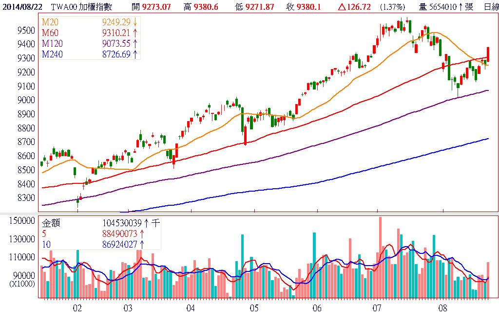 今日金管會主委曾銘宗釋出,將與日本證券交易所合作推出「台日通」業務的利多訊息,不僅激勵金融股出現強漲,似乎也軋到空頭禿鷹,推升加權指數放量突破季線反壓。另在基亞(3176)終結連續二十根跌停帶動下,生技股也跟著回神,櫃買指數則順利站回年線,可惜追價買盤稍嫌不足,生技漲停股並不多,櫃買的成交量未見放大,能否就此站穩年線,仍有待觀察。終場加權指數以9380.10點作收,上漲126.72點,漲幅1.37%,市場成交總金額為1011.74億元。
