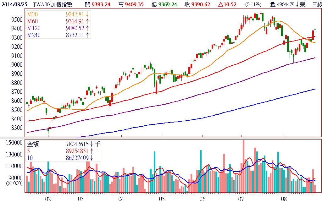 受到近期身為台股多頭急先鋒的金融股高點遇壓影響,多頭攻擊火力暫時熄火,加權指數僅在平盤附近震盪,成交量也縮回到800億元之下。不過,觀察蘋果供應鏈、半導體指標股已開始跟上費半指數、蘋果股價創高的腳步,此趨勢將有助推升指數持續向上反攻。終場加權指數以9390.62點作收,上漲10.52點,漲幅0.11%,市場成交總金額為757.45億元。