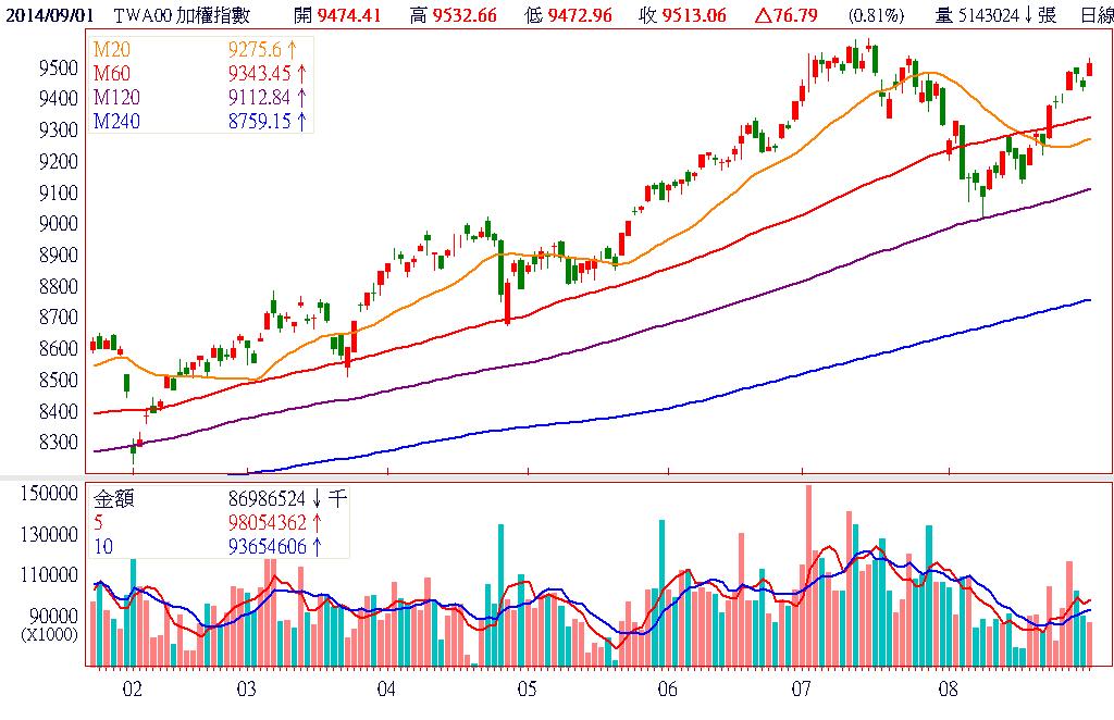 受惠史上規模最大的國際半導體展將於9月3日登場,市場資金大舉湧進半導體類股,成為推升今日指數上攻的多頭大軍,晶圓代工龍頭台積電(2330)、封測二哥矽品(2325)、IC設計龍頭聯發科(2454)股價漲幅均逾3%,上市半導體類股指數漲幅達2.8%。在市場氣氛轉趨熱絡下,不僅大型權值股持續強攻,就連先前傳聞金主斷頭的主力股也出現強彈的表現,顯示內資也開始陸續回籠,將有助提高個股的操作勝率。終場加權指數以9513.06點作收,上漲76.79點,漲幅0.81%,市場成交總金額為868.20元。