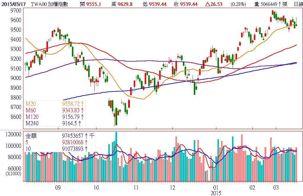昨日美國公布2月工業生產數據,低於原先市場預期,投資人解讀聯準會可能會因此而延遲進入升息的腳步,不僅激勵美股止跌大漲,也同步帶動亞股早盤均以上漲開出,唯明日將進行期貨結算的台股,追價買盤相對消極,加上賣壓異常沉重,造成加權指數呈現開高走低一路向下的走勢,盤面個股跌多漲少,僅剩台積電(2330)、大立光(3008)、漢微科(3658)等指標股進行撐盤動作,頗有拉東出西的跡象,投資人要開始提高警覺。終場加權指數以9512.91點作收,下跌66.44點,跌幅0.69%,市場成交總金額為812.46億元。