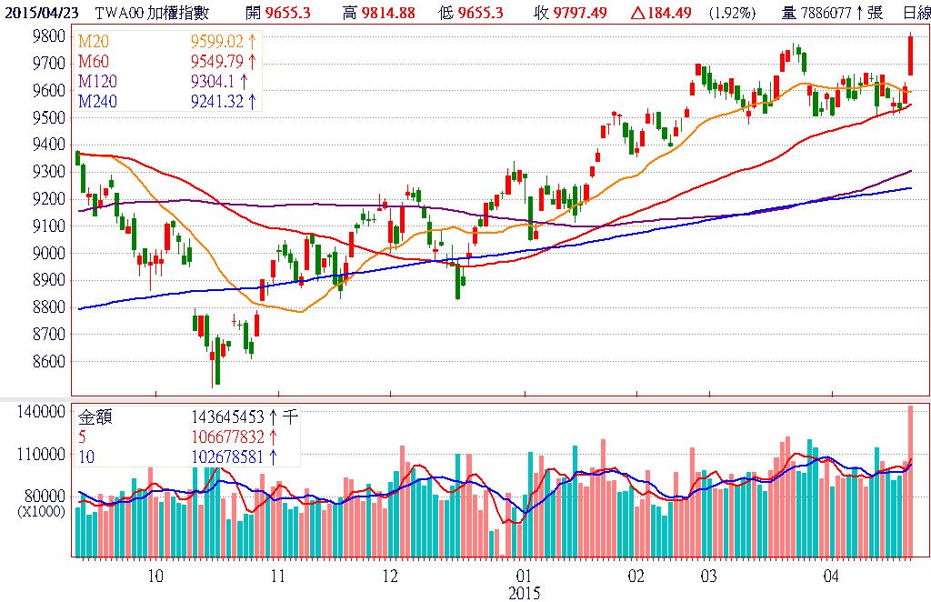在中國證監會釋出「滬台通」議題後,金管會主委曾銘宗回應可能先從ETF開始,被市場視為中國大媽投資台股有譜,激勵金融股全面放量噴出,有望被ETF列入的台灣50及中型100成分股也跟著大漲,受惠電金雙引擎推升,加權指數大漲近200點,改寫波段新高,頗有多頭強勢表態的跡象。終場加權指數以9797.49點作收,上漲79.02點,漲幅0.83%,市場成交總金額為1026.39億元。
