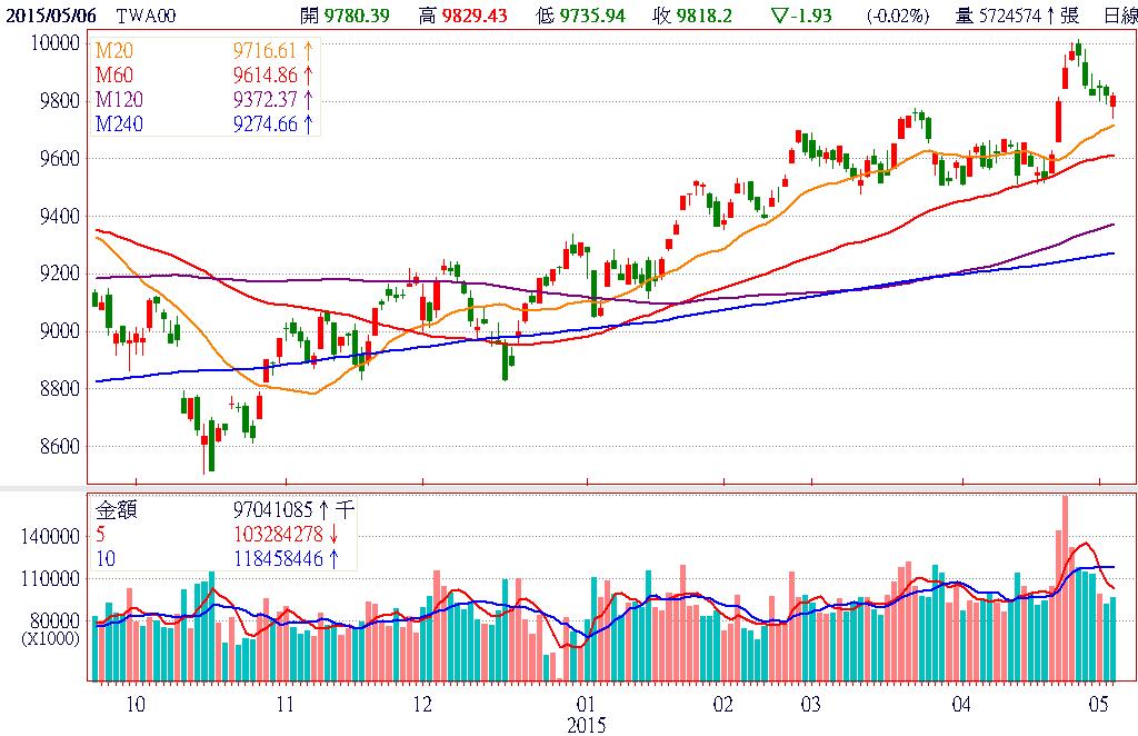 受希臘債務協商出現變數影響,歐美股市全面下跌做收,造成今日台股早盤順勢開低回測月線支撐,所幸九點半過後買盤進場拉抬電子股,跌幅快速向上收斂,盤中一度由黑翻紅,終場則以小跌做收,日K線留了下影線的紅K,增添反彈的契機。終場加權指數以9818.20點作收,下跌1.93點,跌幅0.02%,市場成交總金額為969.27億元。