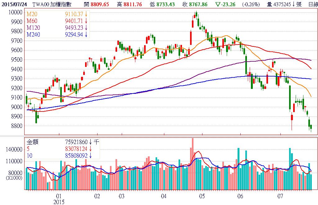 受到美國重量級電子股財報逐漸的公佈,加上大多數企業對於下半年展望不佳的影響,使得電子股仍是為盤中的弱勢族群。雖然費城半導體指數出現反彈,但聯發科(2454)及日月光(2311)等IC設計與封測等半導體族群仍持續破底,大盤也因為產業景氣及技術面雙雙轉弱,而跌破前波低點的8750點,盤面上僅步入旺季的食品類股人氣較為匯集。終場加權指數以8767.86點作收,下跌23.26點,跌幅0.26%,市場成交總金額為765.36億元。