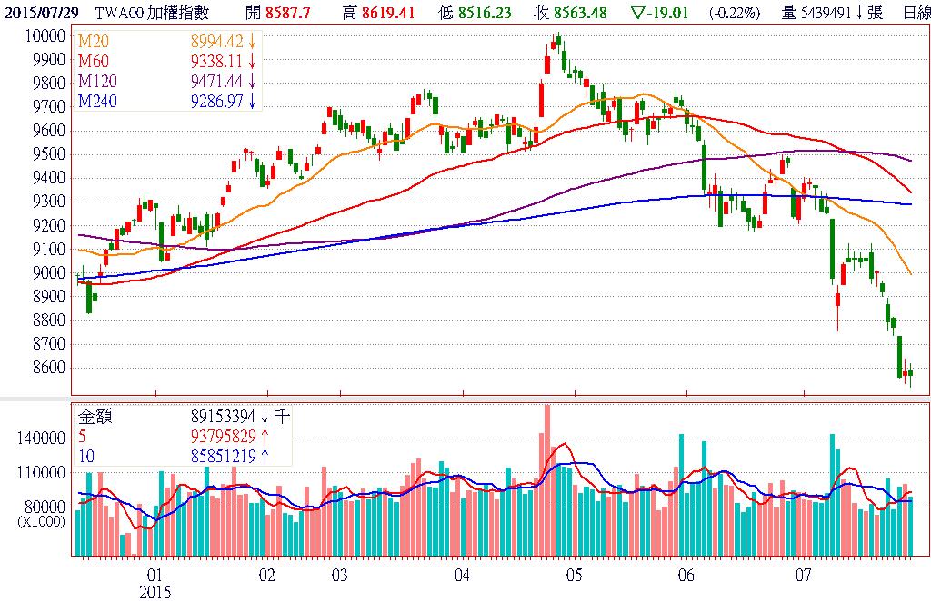 就今日台股表現,可明顯看出市場信心仍非常薄弱,即便有昨日歐美股均上漲1%以上的利多條件,早盤不僅只以小漲開出,甚至沒多久就馬上打到盤下,昨日強勢股多下跌修正,進而引發新一波恐慌賣壓,衝擊指數再探波段新低。不過,在歷經融資持續大減後,指數下殺力道似乎有趨緩的情況,是有開始逐底的機會。終場加權指數以8563.48點作收,下跌19.01點,跌幅0.22%,市場成交總金額為890.87億元。