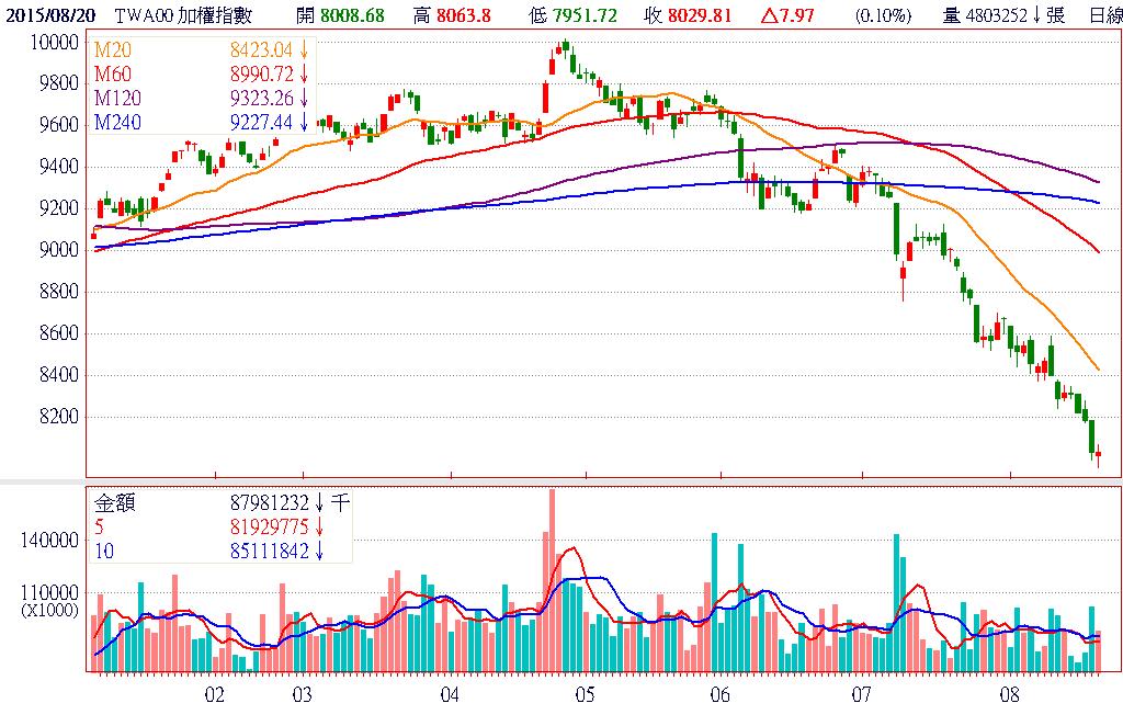 隨著台股進入8000點保衛戰,政府救市的態度開始轉趨積極,廢證所稅、台幣貶值及降息等聲浪四起,似乎有喚回一些多方買盤,即便盤中兩次跌破8000點,均有積極買盤將指數拉回紅盤之上。未來台股能否守穩反攻,還是要看國際盤的變化,目前有實施QE的日本及德國股市,分別面臨半年線及年線的防線關卡,若不幸失守,恐對投資人心理帶來負面的衝擊。終場加權指數以8177.22點,下跌36.2點,跌幅0.44%,市場成交總金額為746.65億元。