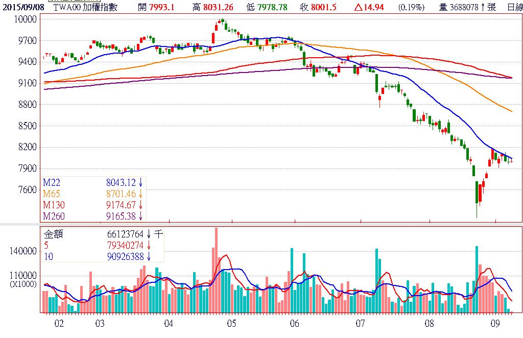 昨日財政部公布8月海關進出口統計,8月出口年減14.8%,已連續7月負成長, 創下2008年金融海嘯以來的最差成績。面對如此差的經濟數據,今日台股卻沒有太大反應,盤中還幾度上攻,收盤再度力守8000點關卡,表現優於市場預期,短線上頗有利空出盡的味道。終場加權指數以8001.50點,上漲14.94點,漲幅0.19%,市場成交總金額為662.76億元。