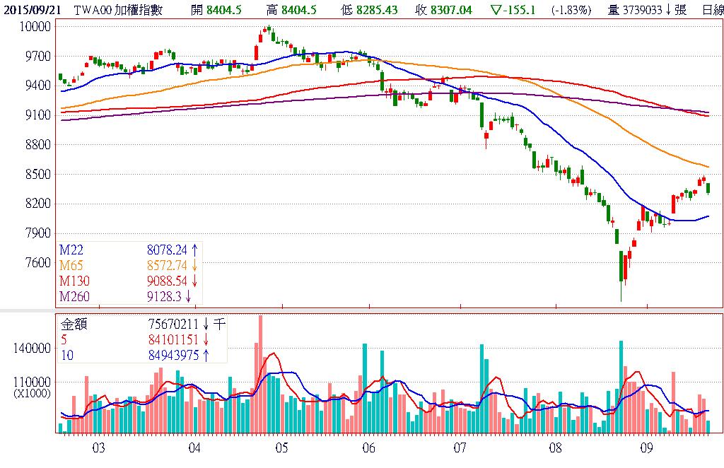 在美國聯準會暫緩升息腳步後,市場焦點轉向經濟成長動能不足的議題,市場賣壓紛紛湧現,已開發國家及新興市場全盤皆墨,台股又因禁空令剛解除,空單伺機大舉進場,殺盤力道自然較大,造成跌幅成為亞股之冠。唯成交量能並未跟著放大,屬於量縮拉回格局,且月線已開始上彎,下檔支撐力道漸強,預期本周休息整理後將有再攻的機會。終場加權指數以8307.04點,下跌155.10點,跌幅1.83%,市場成交總金額為758.48億元。