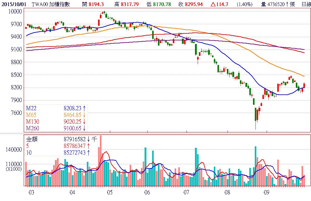 今日盤中中國官方公布的9月製造業採購經理指數(PMI)為49.8,略高於市場預估的49.6,同時較上月微升0.1個百分點,中國經濟暫時止住下滑趨勢,成為激勵亞股全面大漲的最大利多。台股也在此數據公佈後,開始急拉上漲逾百點,可惜量能無法有效跟上,若無法趕快補量,買盤恐會再度轉為觀望。終場加權指數以8295.94點,上漲114.70點,漲幅1.40%,市場成交總金額為878.25億元。