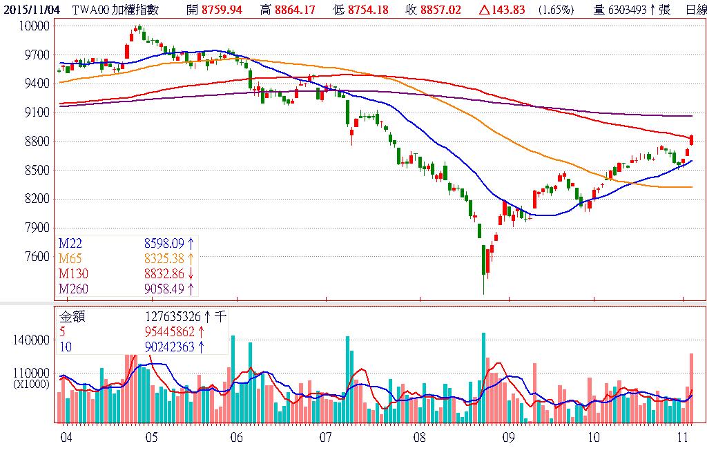 昨日傳出馬習會將於本週六舉行,市場預期將為兩岸間帶來紅利,激勵台股帶量大漲衝破8800點整數關卡及半年線反壓。預期在技術面轉強、技術指標轉正、外資籌碼偏多帶動之下,近日台股仍有向上挑戰的空間。只是一旦出現高檔暴量黑K,投資人就要提高警覺,適度降低持股比重。終場加權指數收在8857.02點,上漲143.83點,漲幅1.65%,市場成交總金額為1274.73億元。