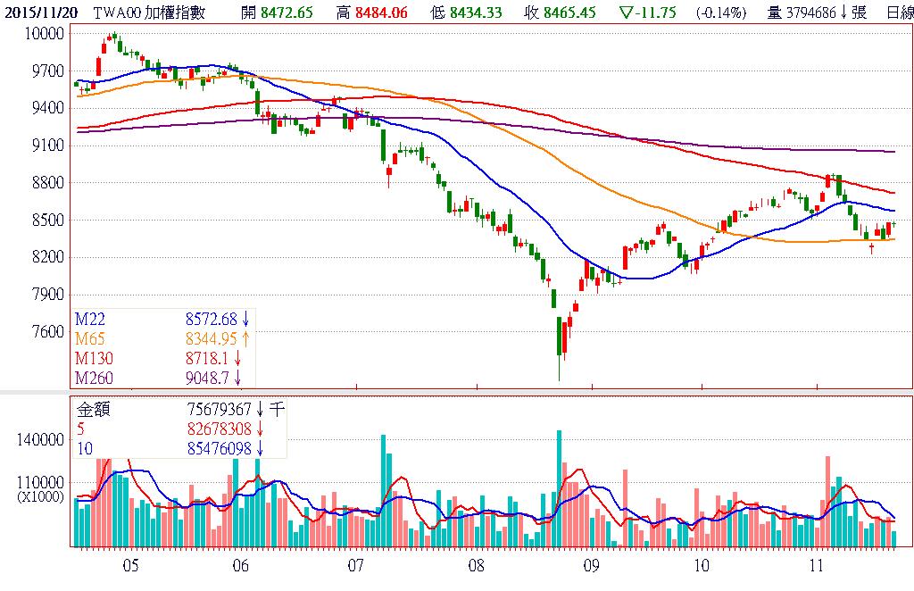由於今日盤後經濟部將公佈10月份外銷訂單,市場態度明顯轉為觀望,加上週末前賣壓的慣性,造成昨日剛大漲的台股,又轉為量縮拉回的走勢,表現明顯弱於其他亞股。由於外資期貨多單留倉仍維持高檔,對台股後市看法依舊偏多,相信只要外銷訂單數字不要太濫,下周台股就會再度轉強上攻。終場加權指數收在8465.45點,下跌11.75點,跌幅0.14%,市場成交總金額為755.94億元。