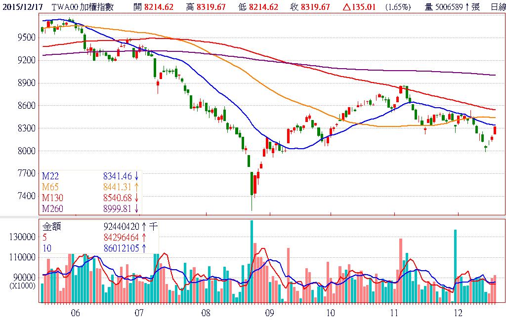 今日凌晨美國聯準會宣布升息一碼,符合市場預期,原先觀望買盤再度進場,激勵美股出現拉尾盤走勢,同時帶動亞股普遍向上開高,台股也在此趨勢下,今日盤勢完全由多方主導,一路開高走高收最高,加上盤後央行意外宣布降息半碼,有助增添台股向上反攻的資金動能。終場加權指數收在8319.67點,上漲135.01點,漲幅1.65%,市場成交總金額為918.85億元。