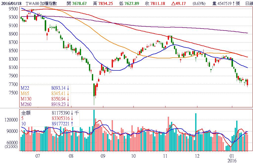 上週末傳出美國與歐盟將解除伊朗的石油禁運制裁,在供需缺口將進一步擴大的預期,不僅讓油價跌破29元的新低,更衝擊歐美股市出現2%以上的跌幅。國內又因民進黨將完全執政,市場擔心恐會影響兩岸關係及經濟發展,造成今日台股期現貨均是以跳空大跌開出,但在亞股跌幅領先收斂的帶動下,承接買盤積極進場,加上盤中傳出國安基金將護盤至四月中的訊息,激勵加權指數由黑翻紅一路上攻,盤中高低點價差超過兩百點,並留下自去年底下跌以來的最大紅K棒。終場加權指數收在7811.18點,上漲49.17點,漲幅0.63%,市場成交總金額為811.17億元。