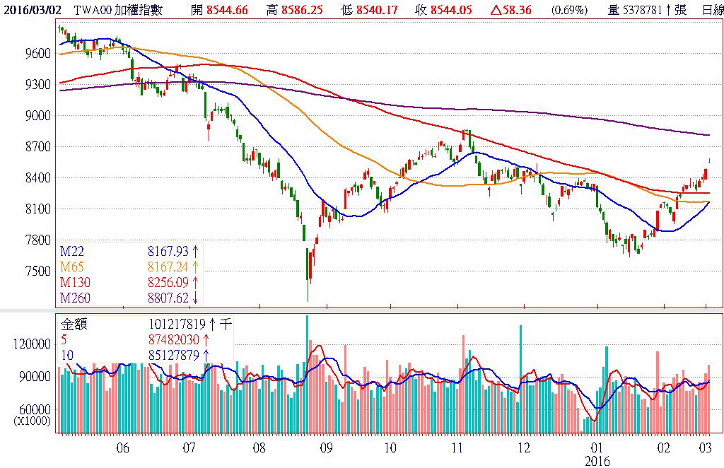 由於國際金融市場,目前持續為「熱錢游資滿溢」狀態,市場資金動能持續增強;同時,依舊未見到具高度重要性、強度足以扭轉國際股市走向重大利空現身;亦未遭逢市場人士意料之外、影響程度重大的「黑天鵝」系統性投資風險籠罩,因此,預估台股後市走向,持續現有彈升漲勢型態、慣性可能性相當高,故現階段仍可順勢偏多操作。終場加權指數收在8544.05點,上漲58.36點,漲幅0.69%,市場成交總金額為1011.20億元。