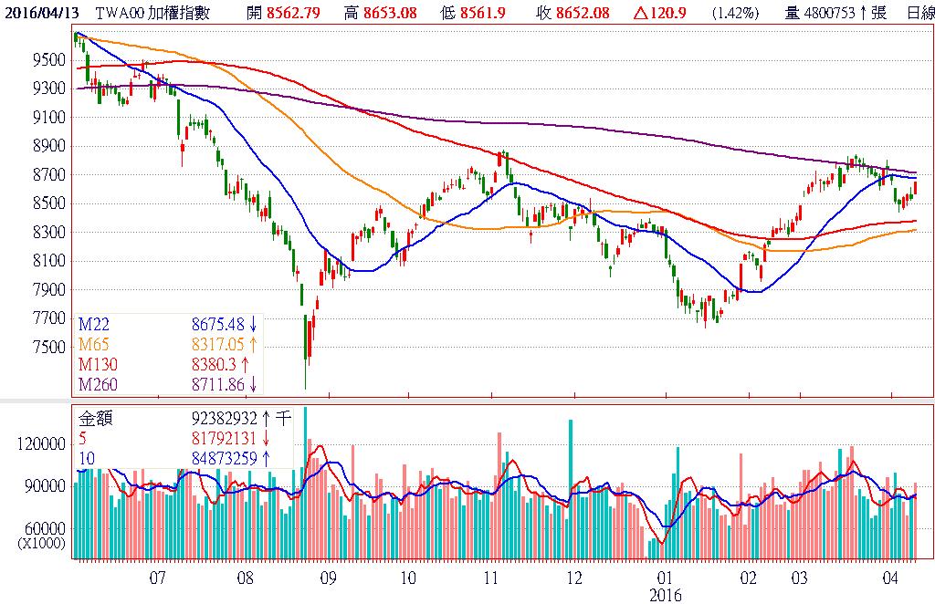 昨日傳出沙國與俄羅斯達成凍產協議,激勵油價再創波段新高,並帶動歐美股同步大漲。今日亞股則受此多頭氣氛加持,順勢開高走高,台股更在即將召開法說的台積電(2330)領軍上攻帶領下,指數上漲逾百點,回補4月6日的跳空缺口。不過,相較大型權值股的奮力反攻,中小型股的反彈力道卻明顯不足,櫃買指數僅收復跌幅的一半,成交量也並未放大,陷入轉指數、陪價差的情況。終場加權指數收在8652.08點,上漲120.90點,漲幅1.42%,市場成交總金額為903.23億元。