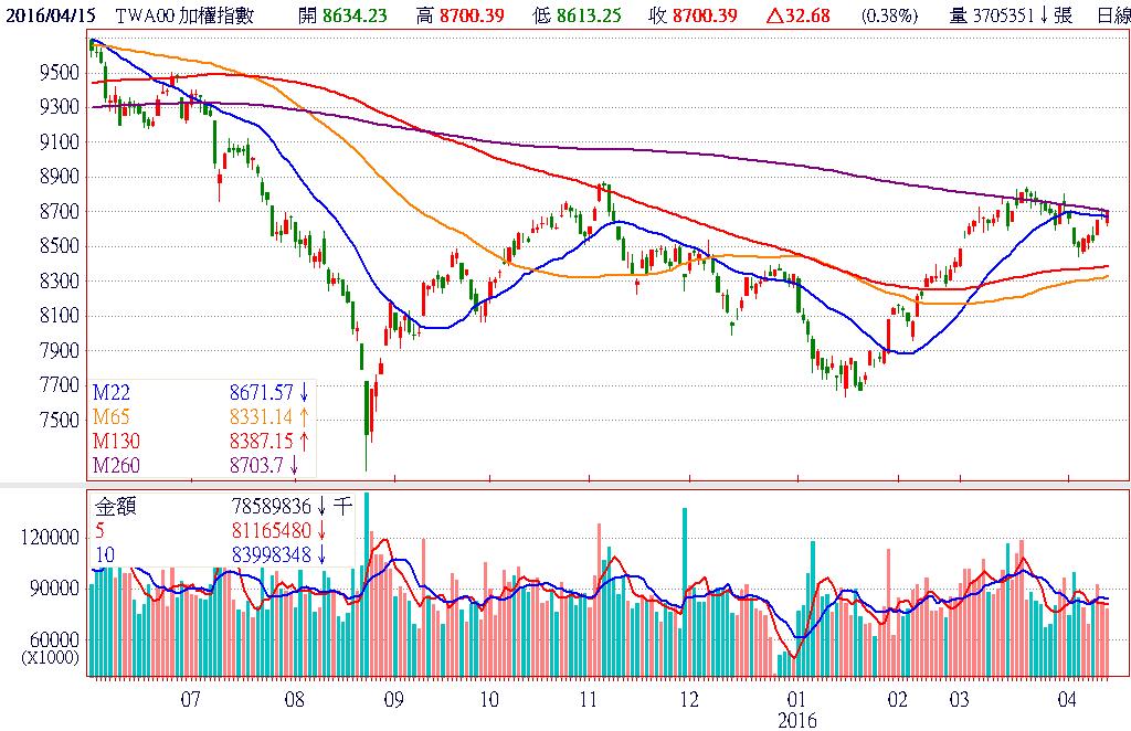 昨日法說釋出第二季營運展望不佳的台積電(2330)及大立光(3008),今日股價直接跳空開低,拖累台股跟著同步開低。令人意外的是,兩檔股票的低接買盤十分強勁,隨著跌幅逐步收斂,也帶動台股在10點前就順利由黑翻紅,加上金融股適時轉強,讓指數一路穩在盤上,終場以最高點收在8700點,離年線僅差了三點。終場加權指數收在8700.39點,上漲32.68點,漲幅0.38%,市場成交總金額為785.08億元。