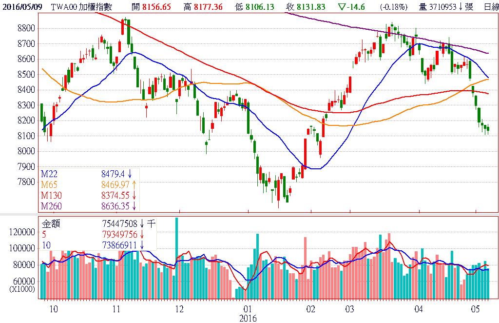 上週美國公佈不如預期的非農就業數據,市場普遍認為聯準會升息時間將因此延後,美股終場由黑翻紅,加上台股短線負乖離已大,投資人多期待今日能夠上演跌深反彈行情。但因美元指數卻未因升息預期延後而走弱,反而有部份投資人開始擔心是否會延長外資提款台股的時間,導致今日買盤不如想像中來的積極,偏偏又遇上儒鴻(1476)、同致(3552)、超眾(6230)、光環(3234)、F-麗豐(4137)等各類股指標,股價因第一季季報或四月營收衰退而打到跌停,打擊市場多方信心,引發失望性賣壓陸續出籠,加權指數終場以下跌做收,創下日K線連七黑的新紀錄。終場加權指數收在8131.83點,下跌14.60點,跌幅0.18%,市場成交總金額為748.93億元。