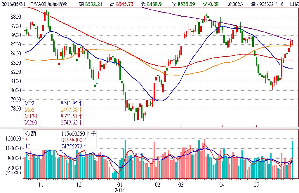受到MSCI調整權重將在盤後生效及高盛將6月MSCI納入中國A股機率由50%提高至70%,盤中明顯見到賣壓,加權指數出現近期較大的回檔走勢,直到午盤過後買盤開始拉抬權值股,跌幅逐步收斂,尾盤更爆出415億元的大量,將指數拉回平盤。終場加權指數收在8535.59點,下跌0.28點,跌幅0.00%,市場成交總金額為1141.13億元。
