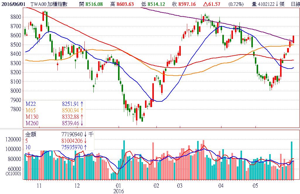 無畏美股、歐股及亞股的拉回,今日台股在外資刻意拉抬權值推升指數下,盤中一度衝上8600點的波段新高。不過,盤面漲幅較大的個股已由先前的強勢股,轉向中環(2323)、錸德(2349)、美利達(9914)等「落後」補漲股,似乎預告本波漲勢已來到尾聲。終場加權指數收在8516.08點,上漲61.57點,漲幅0.72%,市場成交總金額為759.68億元。