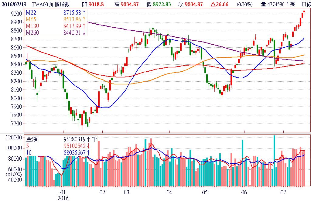 在明日台指期結算前,外資買超台股力道再加大,金額達171億元,力拼拉高結算意圖十分明顯。目前外資累計淨匯入金額已超越去年台股上萬點時的高水位,七月來買超金額已達964億,外資挾著如此龐大的銀彈優勢,在台股大玩期現貨的套利操作,催生本波台股的噴出行情,預期在台灣50股均除完息之前,外資對台股偏多操作的態度將不會改變。終場加權指數收在9034.87點,上漲26.66點,漲幅0.30%,市場成交總金額為950.90億元。