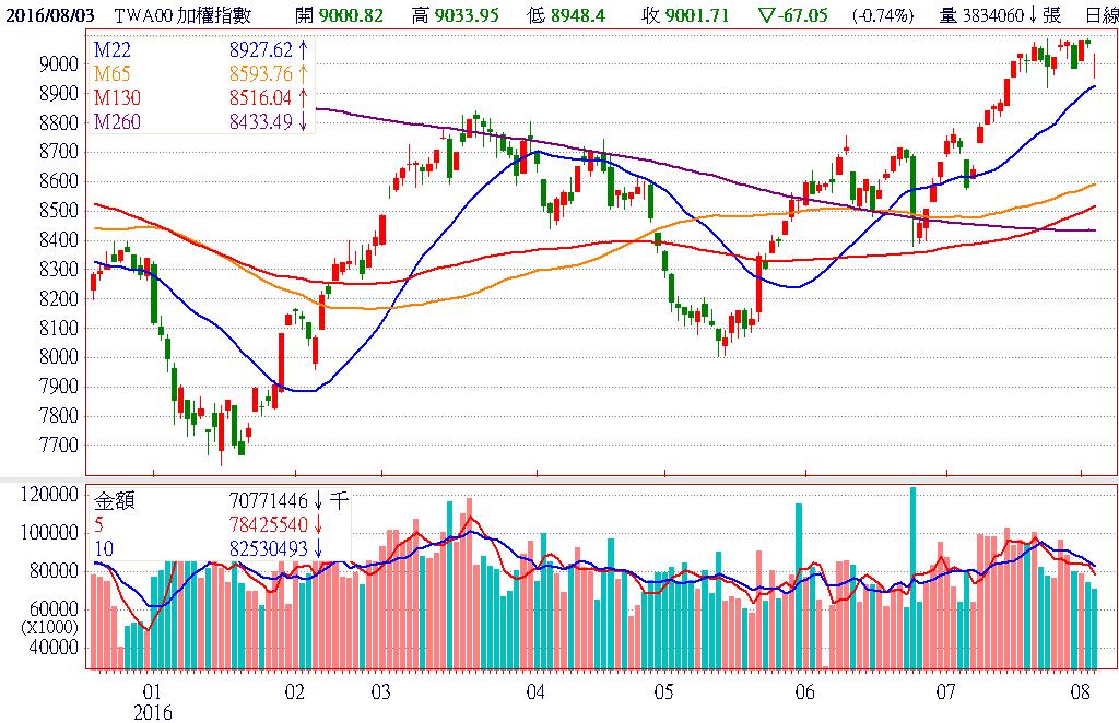 由於近日美元指數持續走弱,顯示國際熱錢資金仍未有「班師回朝」意願,也隱含市場不認為美國聯準會將會在九月例會宣佈升息,加上外資於台指期貨未平倉多單仍高達6.9萬口,即便國際股市短線紛紛漲多拉回,但台股要立即見到反轉走勢的機率應不高。終場加權指數收在9001.71點,下跌67.05點,跌幅0.74%,市場成交總金額為699.04億元。
