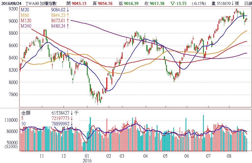 全球金融市場近期多聚焦於美國FED主席葉倫將於全球央行年會的談話,大多數歐、美、日、亞股等國際股市走勢,均見到近乎同步橫盤整理型態;但國際上講求穩定、較負利率相對高報酬,動輒以「千億美元」計算的大部位主權、退休、壽險資金,仍然對台股有所期待、持續青睞。台股短線後市仍有機會順利維持橫盤震盪格局、不致形成頭部型態,破壞場上原本多方控盤主場優勢。終場加權指數收在9017.38點,下跌13.55點,跌幅0.15%,市場成交總金額607.67億元。