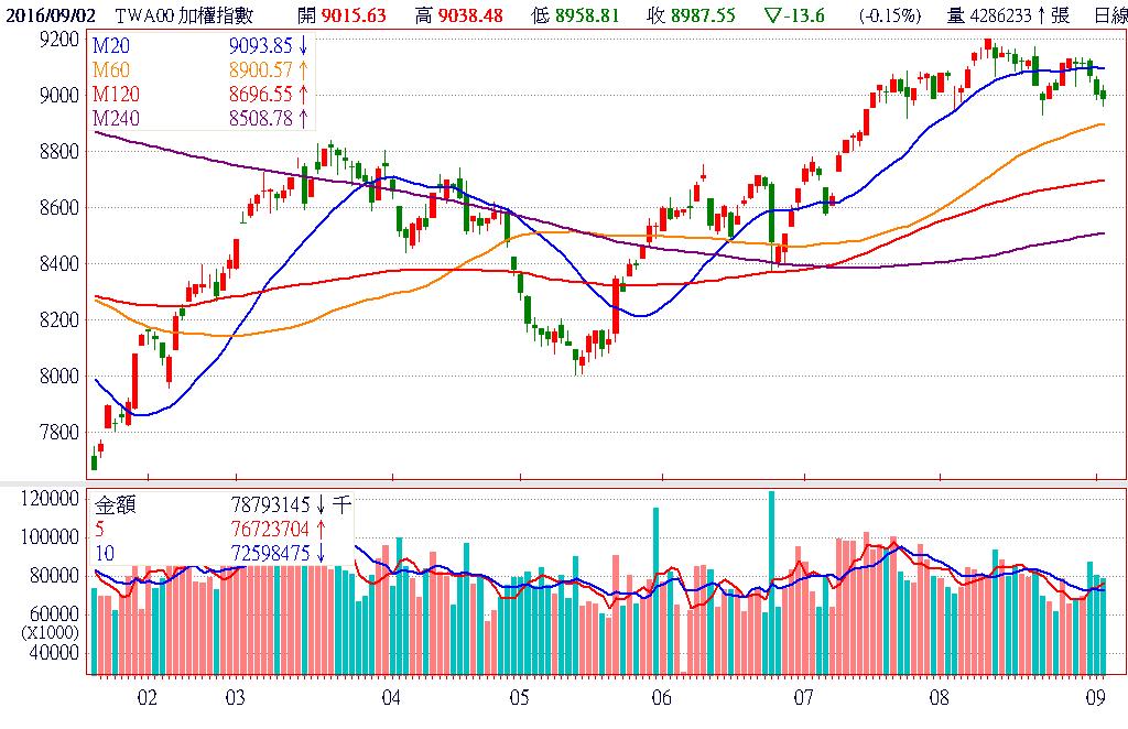受兆豐金(2886)洗錢案及樂陞(3662)收購詐欺案的雙重利空衝擊,市場恐慌氣氛瀰漫,加上反股市 禿鷹小組成軍,金主資金撤出傳聞甚囂塵上,具有主力色彩的中小型股紛紛急殺跳水,又以遊戲、生技、太陽能等族群災情最為慘重,櫃買指數領先大盤長黑摜破季線,加權指數則失守9000點整數關卡。終場加權指數收在8987.55點,下跌13.60點,跌幅0.15%,市場成交總金額786.95億元。