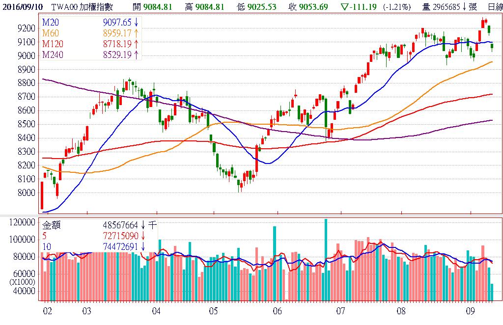 歐洲央行維持利率政策不變,加上聯準會官員釋出鷹派言論,市場對9月美國升息預期機率增加,引發資金大舉撤出風險性資產,造成股市、債市及油價同步大跌的走勢。由於今日台股獨步全球開盤,率先反應昨日的利空衝擊,開盤直接跌破月線重挫逾百點,所幸權王台積電(2330)8月營收超亮眼,激勵股價開低走高,穩在月線之上,為守住台股跌勢的重要功臣。下周美國股債市走勢,將會是影響未來風險性資產多空方向的重要觀察指標,投資人需密切留意。終場加權指數收在9053.69點,下跌111.19點,跌幅1.21%,市場成交總金額484.87億元。