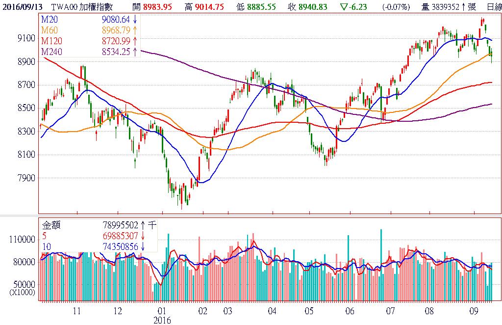 聯準會鴿派官員發表最新鴿派言論,降低市場對美國9月升息的預期,激勵美股開低走高,收復上周五的2/3跌幅,並帶動亞股普遍開高。但受技術面轉弱、長假前買盤縮手觀望慣性的影響,台股賣壓持續湧現,盤中指數一度翻空大跳水,所幸特定買盤進場拉抬,將跌幅快速收斂,盤勢轉為量縮震盪,預期明日行情維持橫盤整理的機率較高。終場加權指數收在8940.83點,下跌6.23點,跌幅0.07%,市場成交總金額779.64億元。