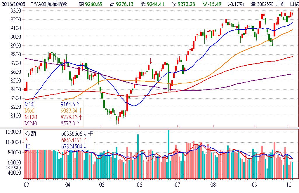 受美股回檔影響,台股無法續攻挑戰波段新高,全日都在盤下量縮遊走震盪。倒是場上僅剩的外資主力,今日籌碼仍是持續偏多,期現貨均站在買方,有利台股多頭架構。不過,盤面個股表現,依舊受到量能不繼影響,資金流向仍以中小型股為主。終場加權指數收在9272.28點,下跌15.49點,跌幅0.17%,市場成交總金額601.31億元。