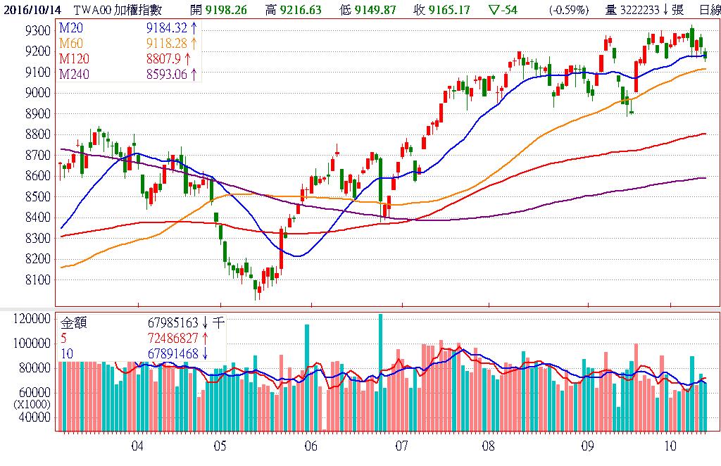 昨日權王台積電(2330)及股王大立光(3008)的法說內容雖優於預期,但在先前股價提前反應利多及近期亞幣轉貶的影響下,今日雙雙遭到外資調節,出現利多不漲的情況,衝擊市場信心,引發內資恐慌賣壓大舉出籠。隨著內資籌碼持續撤退,以中小型股為主的櫃買市場明顯成為重災區,又以生技股的跌幅最重。反觀集中市場,因外資賣壓不重,跌幅相對較輕。終場加權指數收在9165.17收,下跌54.00點,跌幅0.59%,市場成交總金額673.23億元。