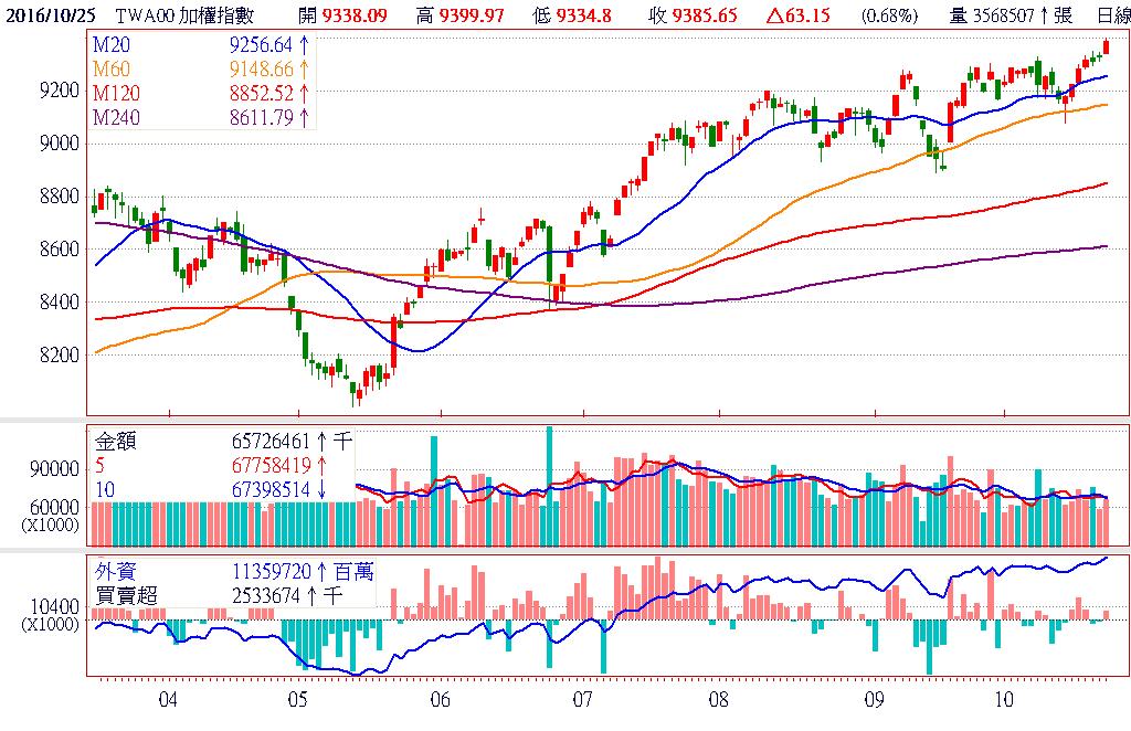 在美股四大指數上漲的帶動下,台股僅存的外資主力順勢偏多操作,用了少少的25億元的買超力道,就將指數推上本波新高的9399點。除了表示量縮下外資好控盤外,也說明目前台股的籌碼相當輕,無須花太大力氣,就可持續創高。由於今日外資期貨再增加2999口,不僅未平倉多單再創新高,更是首次與加權指數同步創高,是否會改變期貨多單創高後即拉回的慣性,是我們該思考的重要問題。終場加權指數收在9385.65點,上漲63.15點,漲幅0.68%,市場成交總金額644.37億元。