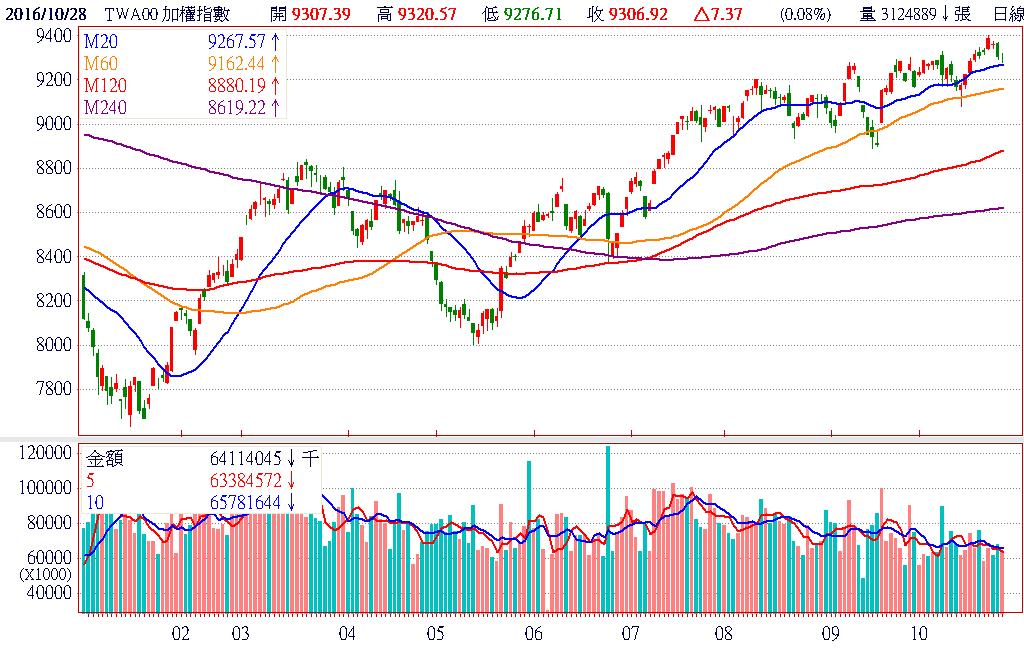 由於蘋果新款Macbook Pro訂價太不親民,引發市場對於銷售量的疑慮,蘋果及國內蘋概股均出現失望性賣壓,加上剛公佈第三季財報虧轉盈的友達(2409),今日股價也見到利多出盡的開高走低表現,引發電子股的調節賣壓。所幸水泥及塑化股維持強勢格局,配合金融股轉強表態,硬是把加權指數推上9300點,守住月線關卡。終場加權指數收在9306.92點,上漲7.37點,漲幅0.08%,市場成交總金額611.55億元。