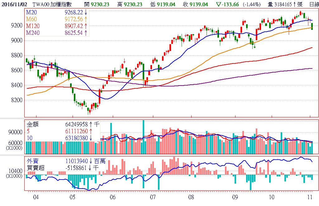 美國聯準會將於台灣時間周四凌晨2點公布最新利率決策,加上美國總統候選人川普民調領先擴大,加快外資調節的腳步,造成今日亞股全面收黑。台股不僅加權指數跌破季線,櫃買指數更領先創下近五個月新低,所幸成交量並未隨之暴量,走空訊號代表性較為不足。但受恐慌氣氛漸增的影響,鬆動的籌碼將陸續釋出,連帶指數也還有下跌的壓力。預期下周二美國總統選舉前,台股盤面均將維持弱勢格局。終場加權指數收在939.04點,下跌133.66點,跌幅1.44%,市場成交總金額640.65億元。